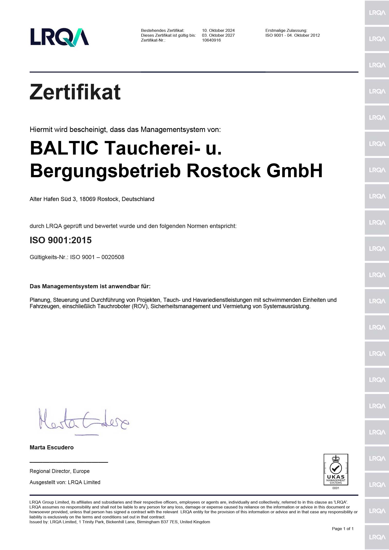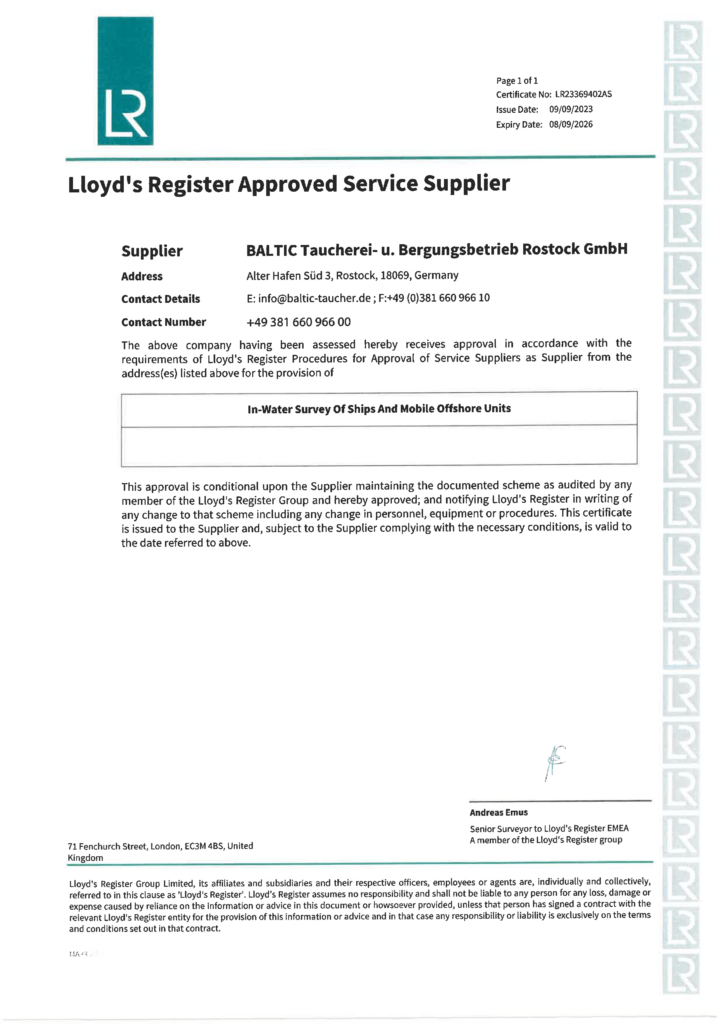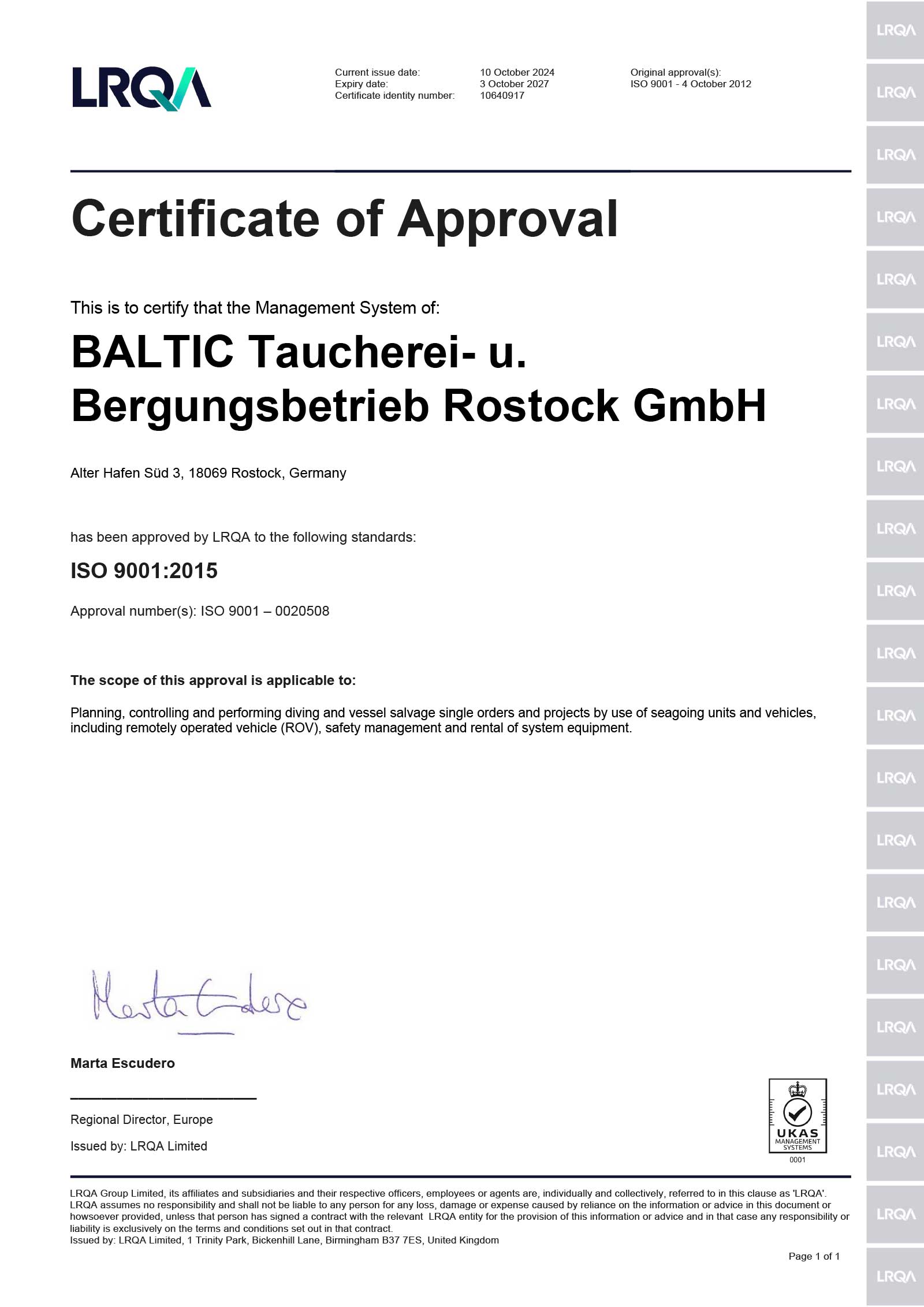 The consistent assurance of contract-compliant and reliable implementation of all work with particular emphasis on occupational safety, environmental protection, and work quality is the declared goal of Baltic Diver Germany. As a service provider for the maritime and offshore industry, the long-term success of our company is closely linked to the success and satisfaction of our customers.